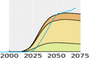 5. Comparing the results with the return-on-energy models from Sgouridis et al. 2016 (see the crude graph below): a) total peak capacity in 2075 is about 100 TWpeak, less than then 165 TWpeak in our calculation; b) total capacity is falling after 2050 in Sgouridis et al. 2016; c) the main growth occurs about 8 years earlier; d) the transition towards capacity is smoother, i.e. in the last 8 years capacity is added slower than in my (purely factory-output-optimized) model.